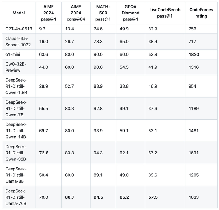 ▲DeepSeek 官方给出的蒸馏版模型的评测对比