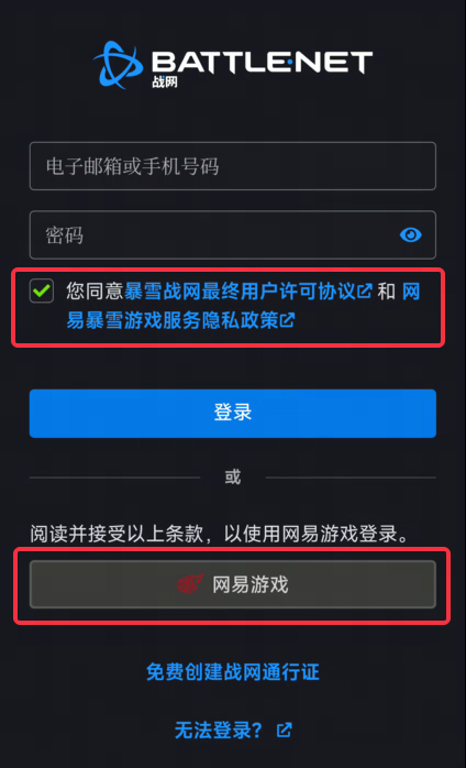 h. 打开战网客户端或战网网页,阅读并勾选同意条款,点击网易游戏按钮,登录已实名迁移的网易账号。