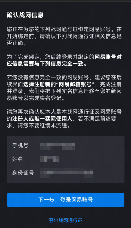 e. 确认需要绑定的战网通行证信息,点击【下一步,登录网易账号】。