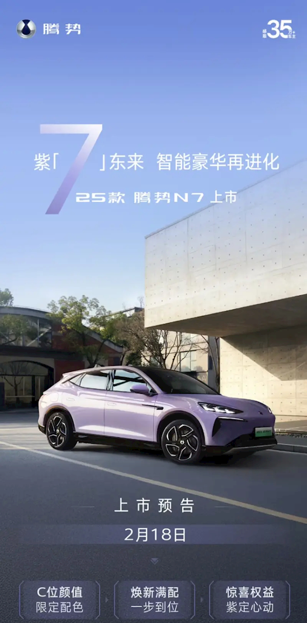 快科技2月12日消息,腾势汽车宣布,2025款腾势N7将于2月18日上市,新车型将新增“极光紫”高定配色。