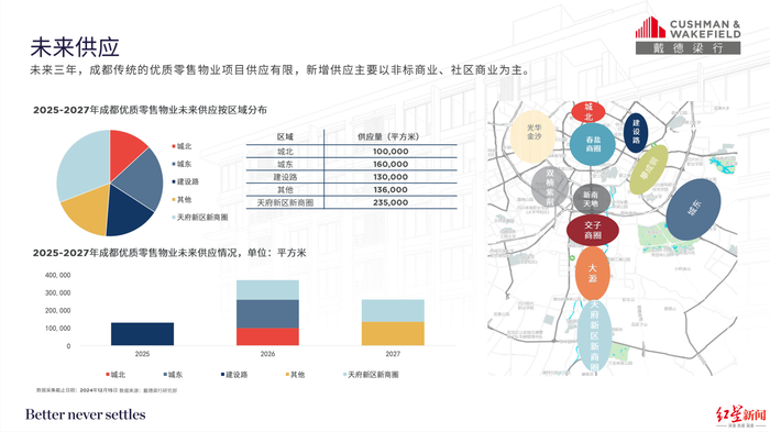 对于未来发展,戴德梁行预计成都非标商业和社区商业将成为成都商业市场发展的主要动力之一。由于传统商业存量规模较大以及消费者年轻化等因素,成都的非标商业形态得以迅速扩张,比如玉林、东郊记忆等项目。2024年成都新开出的CPI,赢得了大量的热度和流量。