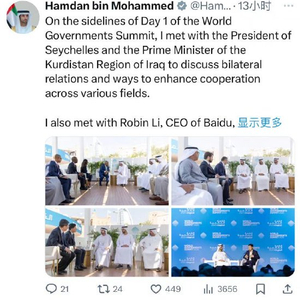 百度 CEO 李彦宏昨日与阿联酋 AI 部长奥马尔-苏丹-奥拉马(Omar Sultan Al Olama)展开对话,部长表示“期待明年大会上,所有车队都能由萝卜快跑支持的自动驾驶车辆组成。”