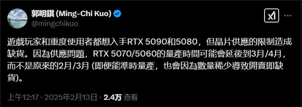 郭明錤还表示,即使量产时间未推迟,这两款显卡也会因数量稀少而开卖即缺货。