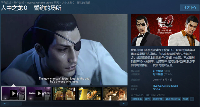 人中之龙0所获得的评价相当高,也是许多中国玩家第一次接触人中之龙系列的契机。