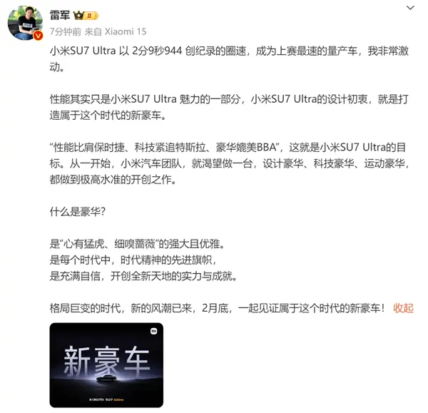 最后,雷军还重申:“格局巨变的时代,新的风潮已来,2月底,一起见证属于这个时代的新豪车!”