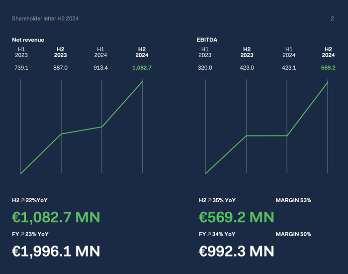 具体来看,2024年下半年,Adyen净收入10.827亿欧元,同比增长22%;支付处理量为6664亿欧元,同比增长22%(其中,POS机支付处理量为1371亿欧元,同比增长48%);息税折旧摊销前利润(EBITDA)为5.692亿欧元,同比增长35%,息税折旧摊销前利润率(Ebita margin)为53%;自由现金流转换率为88%;资本支出占净收入的5%。