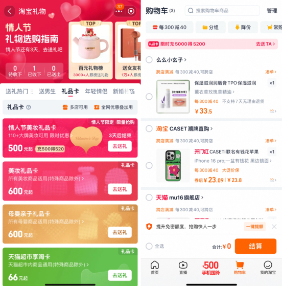 近期,淘宝送礼还推出了情人节限定美妆礼品卡,520元、5200元两种面额,可跨店消费大牌美妆产品,支持超过110家大品牌。