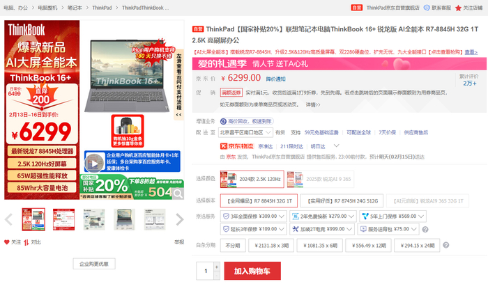 补贴到手价5040元!联想ThinkBook16+锐龙版AI全能本