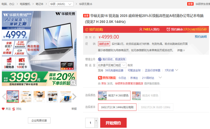 补贴到手价3999元!华硕无畏16锐龙版上新