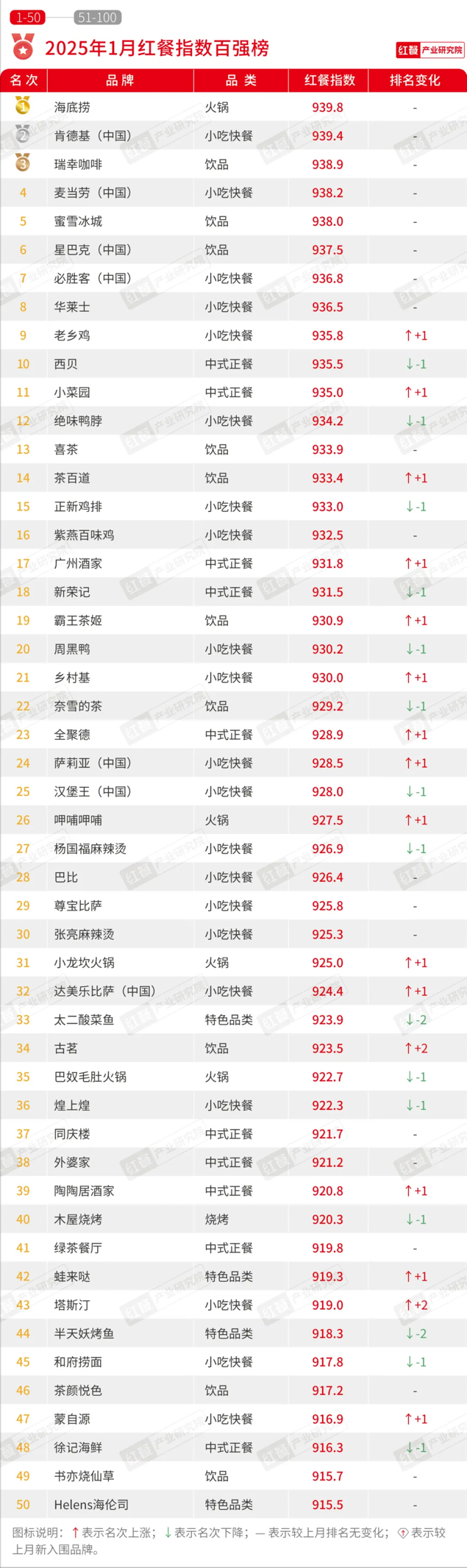 2025年1月红餐指数百强榜发布
