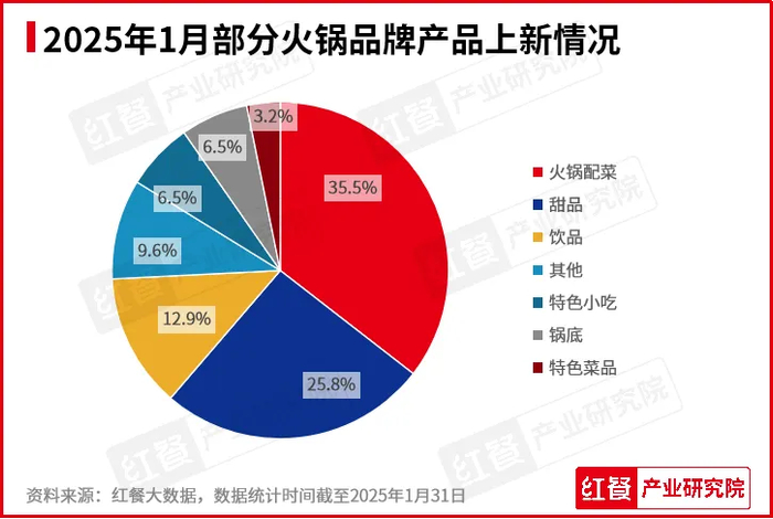 2025年1月,在红餐产业研究院监测的火锅品牌中,有12个火锅品牌共推出了31款新品。从新品的细分种类来看,当月火锅新品涵盖的种类有火锅配菜、甜品、饮品、锅底、特色小吃、特色菜品和其他。