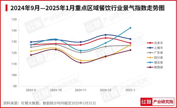 2025年1月,广东、四川、湖北、陕西的餐饮行业景气指数呈现上升趋势,北京、上海两地餐饮行业景气指数呈现下滑趋势。
