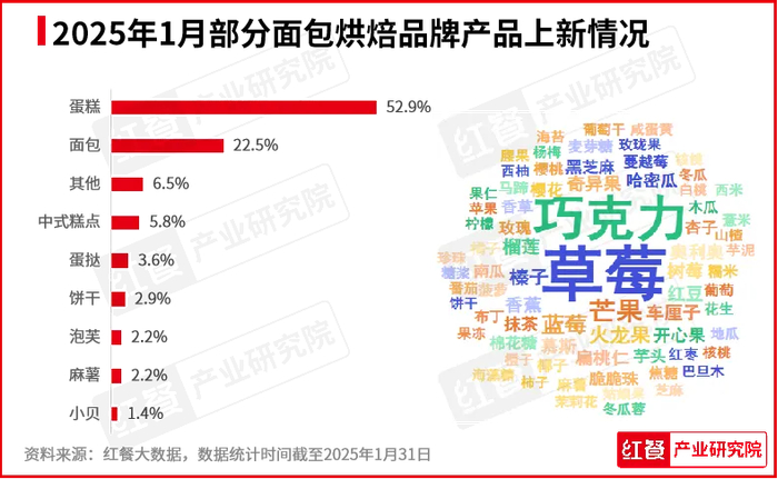 2025年1月,在红餐产业研究院监测的面包烘焙品牌中,有29个面包烘焙品牌共推出了138款新品。