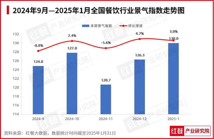 2025年1月的景气指数实现了显著的突破,达到了近5个月的峰值,也直观地反映出全国餐饮行业的蓬勃发展,消费市场活力不断释放。具体数据显示,全国餐饮行业景气指数呈现出强劲的增长态势,从2024年12月的126.3增长为2025年1月的130.0,环比增长为3.0%。