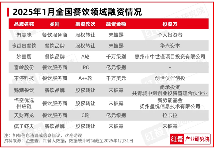 2025年1月,餐饮领域融资事件总数较2024年12月有所增加,环比上升50.0%;餐饮上下游企业IPO动作较为活跃,共有7家企业透露IPO动向。