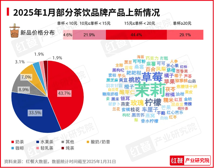 2025年1月,红餐产业研究院监测到有51个品牌推出了158款新品,环比下降20.6%。具体而言,奶茶类新品最多,共计69款,占当月茶饮新品的43.7%。水果茶类新品次之,数量为53款,占比33.5%。