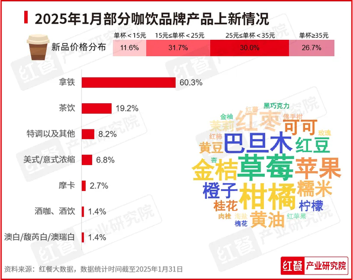 2025年1月,红餐产业研究院监测到有24个品牌共推出了73款新品,环比下降35.4%。其中,拿铁类新品最多,共44款新品,占新品总量的60.3%,其次是茶饮类新品,共有14款,占比为19.2%。