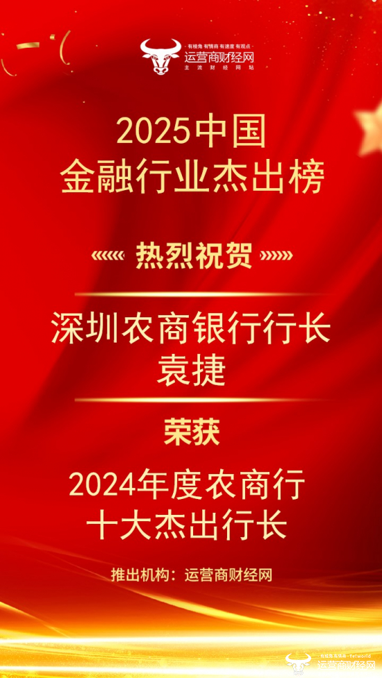 日前,运营商财经网推出了“2024年度农商行十大杰出行长”,其中深圳农商银行行长袁捷获选!