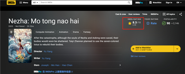 根据国际评分网站IMDb的数据,《哪吒2》开分达到8.1分,截至目前,评分已经涨至8.3分。