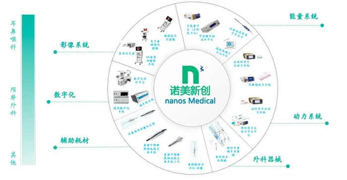 借由这些并购整合动作,诺美新创现已成功打造中国耳鼻喉及颅脊外科器械平台。目前,公司的核心产品包括低温等离子体手术系统、动力系统、医用内窥镜摄像系统、温控高频手术治疗仪、咽鼓管球囊扩张导管、鼻窦球囊、一次性使用鼻咽通气道、鼻窦药物洗脱支架、手术器械等。