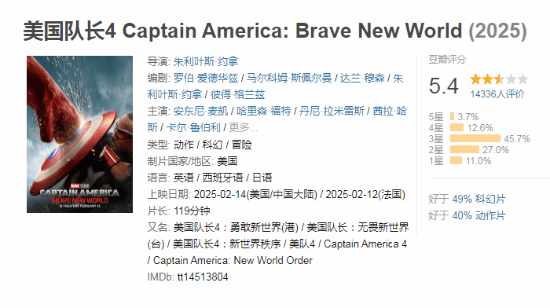 2月15日消息,《美国队长4》豆瓣开分仅5.4分。截至发稿,共有14336人进行了打分,其中超过83%的观众给出了3星及以下评价。