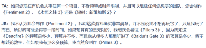 但这种境遇也属无奈,黑曜石的规模和预算都不充裕,很少有机会砸大钱做一款完全原创的3A RPG,帮他人打工反而更“务实”一些。在一次采访中,黑曜石的游戏设计师Josh Sawyer就表达出了对“预算充足”的向往:“如果有机会,我们也想用《博德之门3》的预算和标准出一款《永恒之柱3》。”