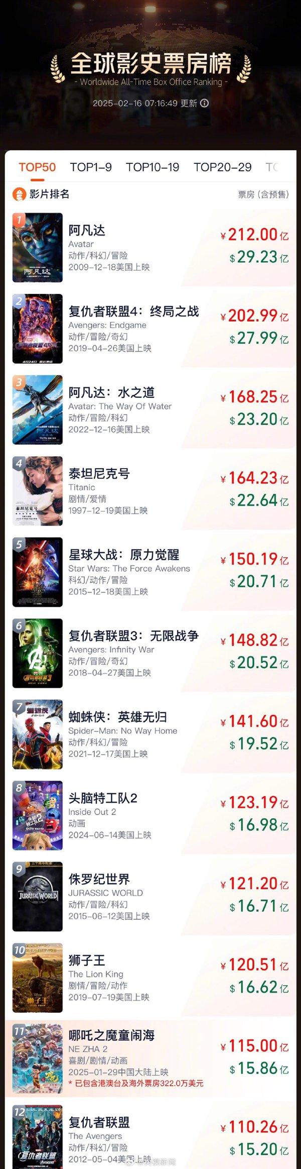 快科技2月16日消息,据网络平台数据,《哪吒之魔童闹海》总票房(含点映及预售)已超115亿元。目前,全球票房榜排名第11,正在向前10发起冲击。