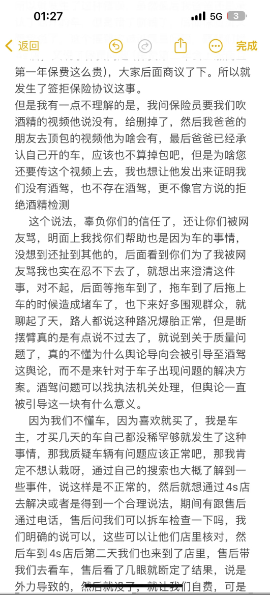 日前,当事车主发布长文回应此事,车主称有一点情况欺瞒了网友,他当初是初衷是解决车子的问题,或者给一个数据的解释,但没想到厂商还接管查酒驾的事,他发誓父亲是在事故后才喝酒的。