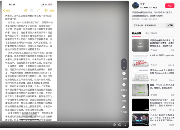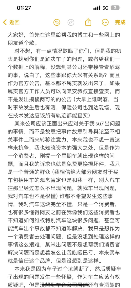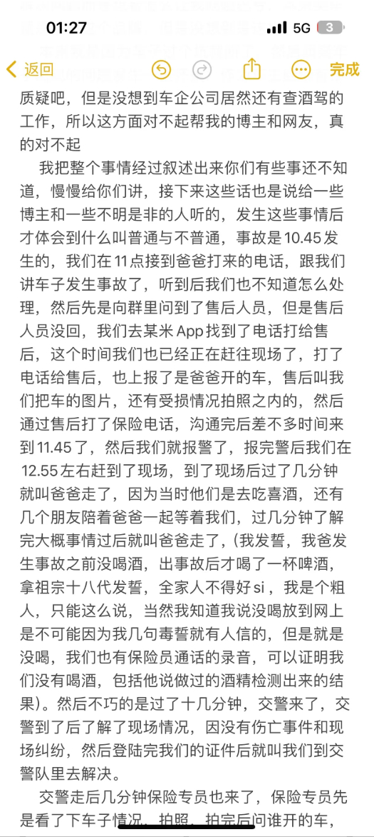 小米SU7过坑“断轴”车主:承认欺瞒网友 我爸是出事故后才喝的酒