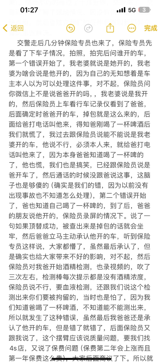 随后,保险要求父亲到场来处理事故,但此时他父亲在酒席上刚喝了一杯啤酒。由于担心被误查是酒驾,他父亲谎称是朋友开的。
