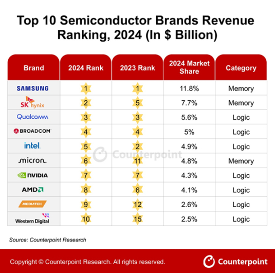 Counterpoint:全球半导体市场 2024 全年营收增长 19%,三星第一、英特尔跌至第五
