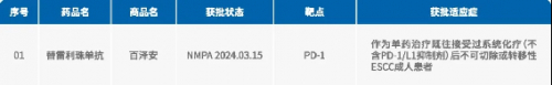2024年3月15日,替雷利珠单抗获FDA批准,作为单药治疗既往接受过系统化疗(不含PD-1/L1抑制剂)后不可切除或转移性ESCC成人患者。此次获批标志着替雷利珠单抗在美国获批首个适应症。