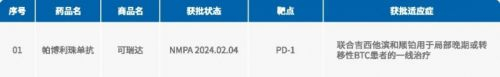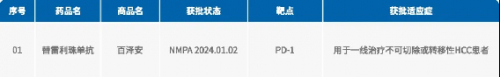 2024年1月2日,替雷利珠单抗已正式获批用于一线治疗不可切除或转移性HCC患者。截至目前,替雷利珠单抗已有13项适应症获得NMPA批准,是目前在中国获批适应症数量最多的PD-1抑制剂,涵盖NSCLC、经典型霍奇金淋巴瘤、尿路上皮癌、HCC、食管鳞状细胞癌、鼻咽癌、胃或胃食管结合部(G/GEJ)腺癌等癌种。
