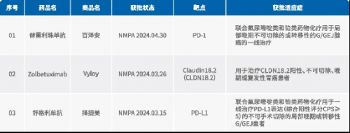 2024年4月30日,NMPA批准替雷利珠单抗联合氟尿嘧啶类和铂类药物化疗用于局部晚期不可切除的或转移性的G/GEJ腺癌的一线治疗。