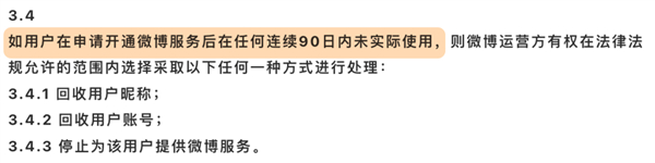 《 微博服务使用协议 》 3.4 里写着,连续 90 天内未实际使用,微博运营方有权回收昵称 / 回收账号 / 停止提供微博服务。