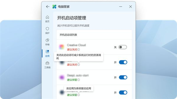 微软电脑管家在本次更新中还对开机启动项管理功能进行升级,新增"建议开启""建议关闭"等提示,并附带说明,帮助用户更直观地了解每个启动项的影响,决定是否在开机时启用或禁用相关项目。