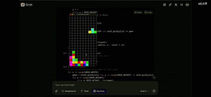 随后团队还现场展示,要求Grok-3现场生成一段太空发射的3D动画的代码,并运行了这段代码,直播画面上显示出了飞船在地球和火星间往返的动画。随即,团队又用Gork-3演示制作了一款类似于俄罗斯方块的游戏。同时,马斯克也在直播中宣布,将在 xAI 推出一个人工智能游戏工作室。