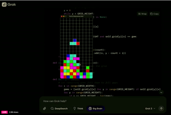 马斯克介绍,Grok-3比上一代的Grok-2能力提升了一个数量级。后续AI用例演示过程中,马斯克及其团队成员让Grok-3 寻找去火星的时间窗口演示了其信息收集和推理能力同时还创作一款融合《宝石迷阵》和《俄罗斯方块》的游戏展示了Grok-3的创意能力