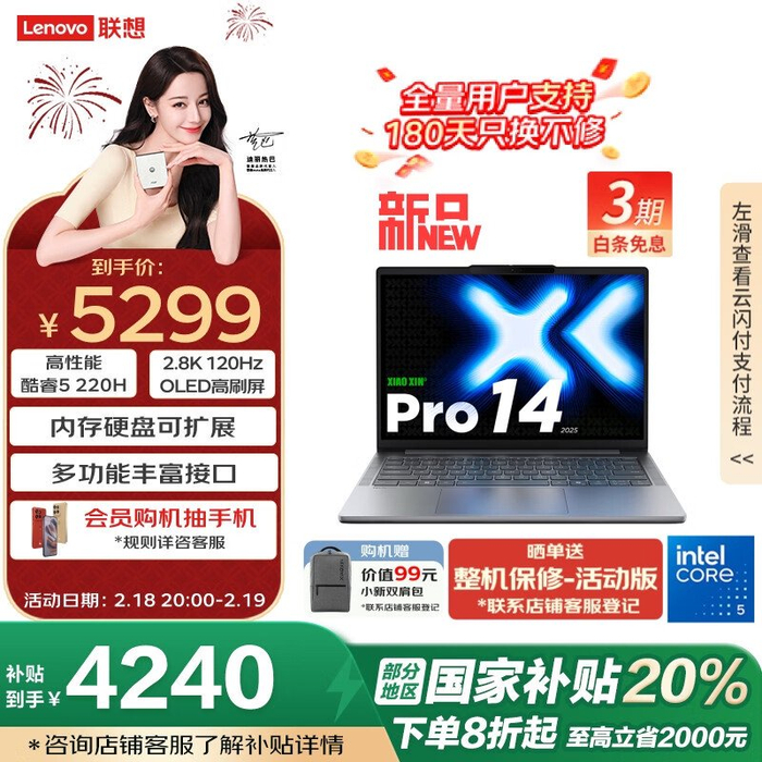 小新 Pro 14:酷睿 5 220H + 24G + 1T=5299 元,补贴后 4240 元