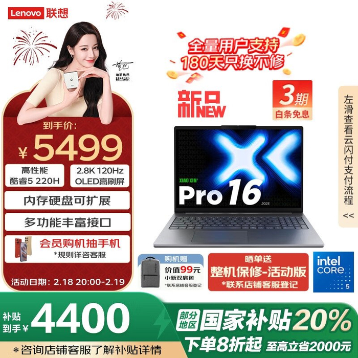 小新 Pro 16:酷睿 5 220H + 24G + 1T=5499 元,补贴后 4400 元