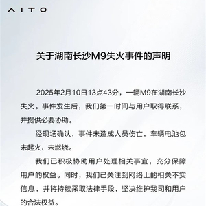 快科技2月19日消息,刚刚,问界用户服务官方发布了“关于湖南厂商M9失火事件的声明”: