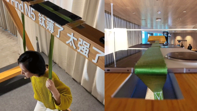 OPPO Find N5的钛合金天穹铰链,通过使用3D激光打印技术,实现了铰链部件的超薄设计,并且增加了36%的刚性。与前代相比,新的铰链技术不仅减薄了厚度,还提高了使用寿命和耐久性。在技术发布会上,四部Find N5甚至成功支撑了一个加秋千的重量,展示了其超高的结构强度。