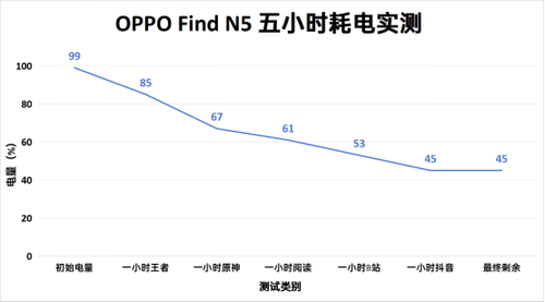 耗电方面,由于折叠屏目前内屏的属性更偏向影音娱乐及办公,但搭载的骁龙8至尊版性能又不错,所以这次我们在外屏测试两个游戏,内屏测试影音娱乐,结合起来看功耗。经过五小时耗电实测,Find N5剩余45%的电量。就日常生活而言,配合有/无线充电,Find N5不会有大的续航焦虑。