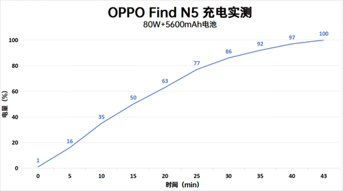 OPPO Find N5 搭载全新 5600mAh 冰川电池,这块双电芯串联的电池采用新一代硅碳负极电池技术,掺硅量提升至 10%,既实现了更高的能量密度,也缓解了易衰减的问题。此外, Find N5支持80W有线以及50W无线充电,有线充电实测15分钟充至50% ,45分钟充至100%。