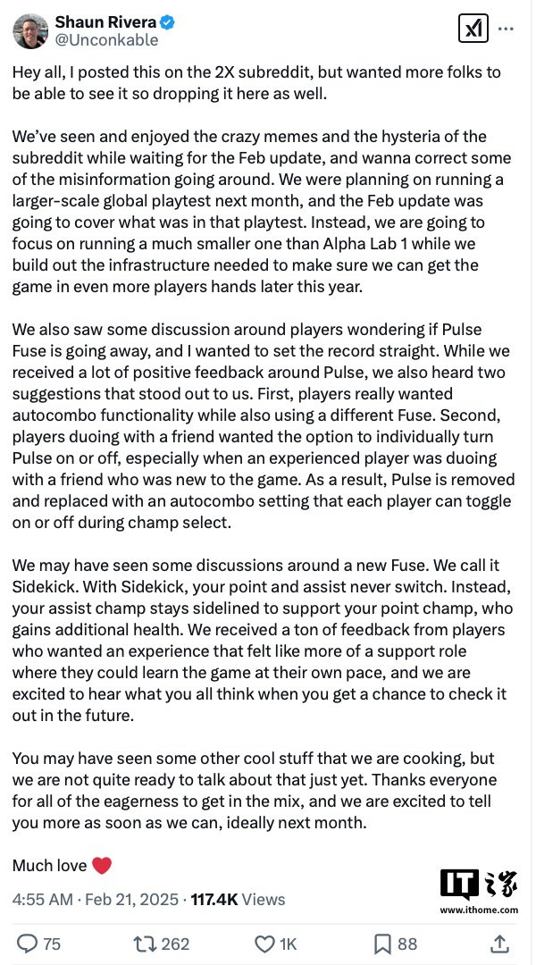 IT之家 2 月 23 日消息,拳头游戏总监 Shaun Rivera 在 X 平台发布公告,声称原定于 3 月举行的《英雄联盟》格斗衍生作品《2XKO》全球测试计划已经推迟,开发团队目前正在就玩家反馈对游戏进行进一步完善,后续进行的测试规模将“小得多”。
