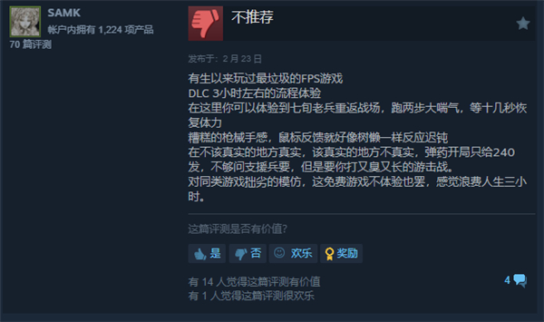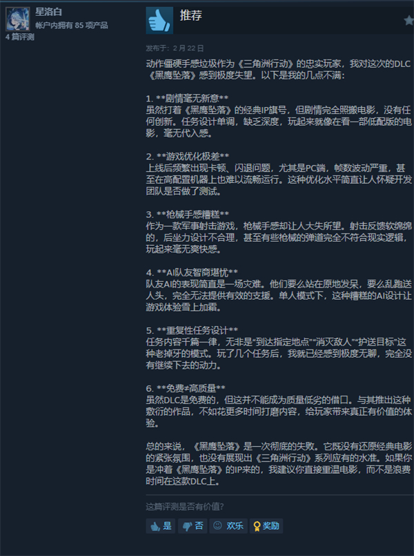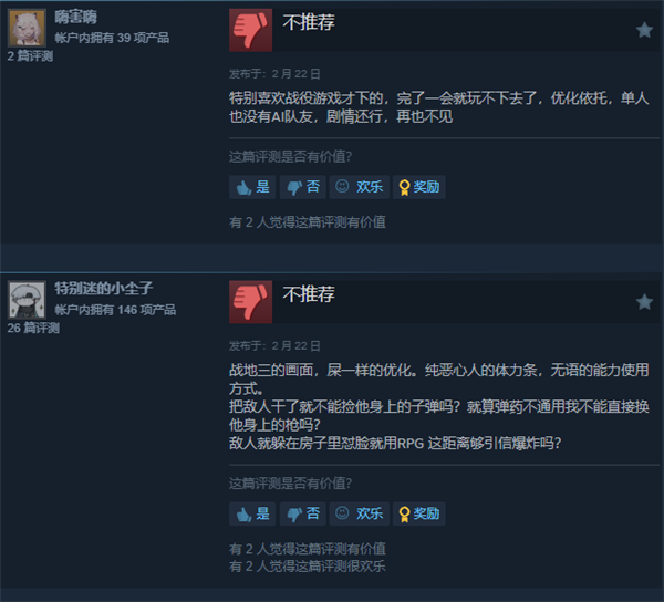 Steam显示,黑鹰坠落DLC目前评价为“多半差评”,2273条评测中,好评为37%,玩家主要吐槽游戏的优化、单人难度太大、需要背板才能通关等。