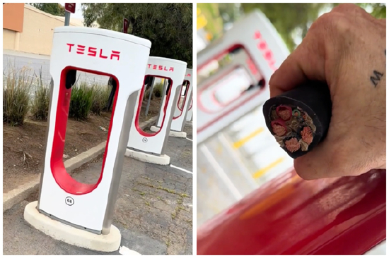 除了在门店抗议之外,愤怒的抗议者还将攻击目标对准了道路上的特斯拉电车。全美各地都出现了特斯拉电车遭到砸鸡蛋、喷油漆甚至还有烧车的蓄意破坏行为。此外,特斯拉超充站也被人恶意割断了线缆。