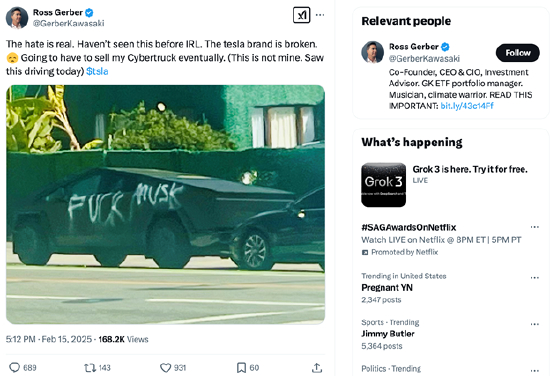“这是真的仇恨。特斯拉这个品牌已经毁了。我得卖掉我的CyberTruck。”在目睹一辆特斯拉CyberTruck被喷上“Fxxk 马斯克”字样之后,美国知名投资者罗斯·盖博(Ross Gerber)这样感慨说。他共同创办的Gerber Kawasaki财富管理公司是特斯拉的早期投资者,也因为特斯拉股价从2019年以来的持续飙升而赚得钵满盆满。