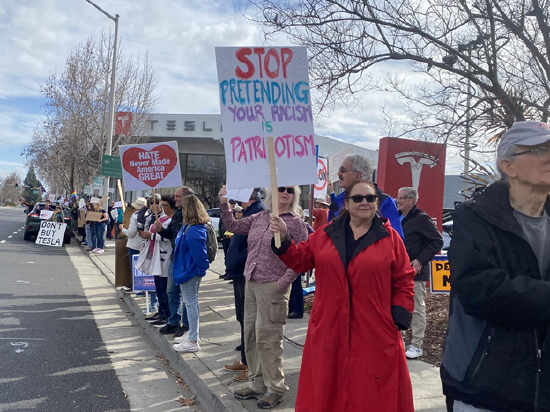 过去两个周六,从旧金山到纽约,美国各地的特斯拉门店都迎来了抗议人群。数十名抗议者站在特斯拉门店高喊口号,他们手中举着的标语写着“别给马斯克送钱”、“亿万富翁偷穷人钱”、“马斯克正在偷走你的钱”、“阻止马斯克政变”、“打倒法西斯”等等。
