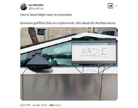 在这场政治风波中,特斯拉就成为了马斯克涉足政坛的牺牲品,不仅遭到左派民众的持续抵制,更不断遭到激进分子的喷漆、打砸甚至纵火枪击。